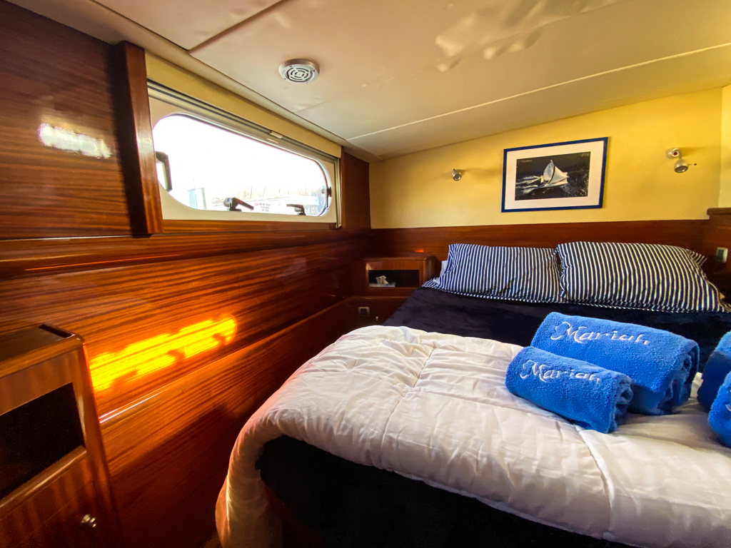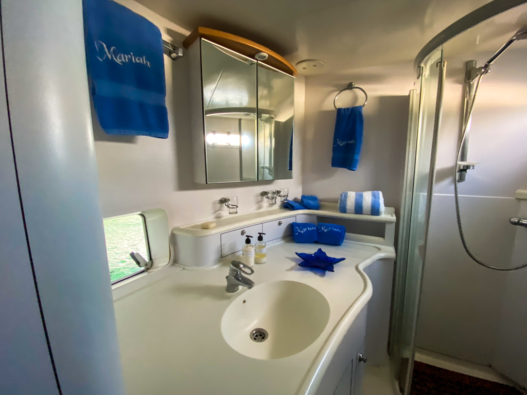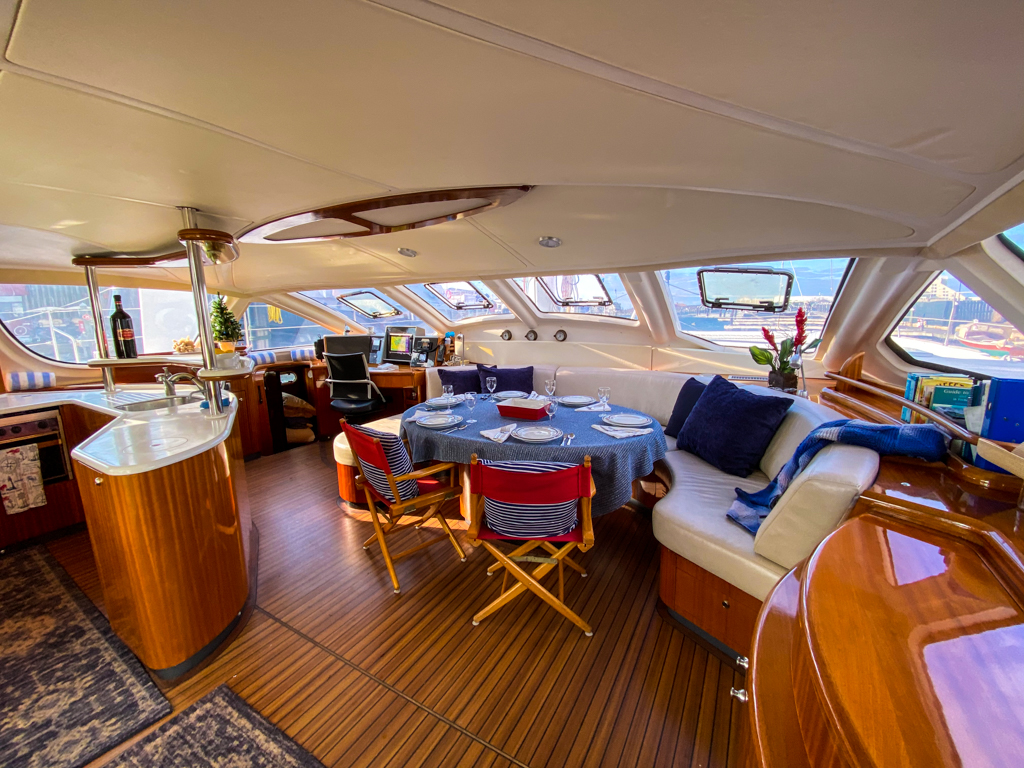 MARIAH is an elegant, powerful sailing, meticulously refit catamaran featuring 3 cabins and 4 heads. MARIAH is a perfect yacht for many people, safe, strong and beautiful. The boat features a standard 3 cabin owner’s version with an incredible amount of space for the owner’s cabin, and separate companionways for the guest side. The boat also has a captain’s quarters, and crew quarters forward.If you are looking for the perfect comfortable, fast, real sailing boat for an around the world, or business, take a look at Mariah. She is strong, safe, and very luxurious.