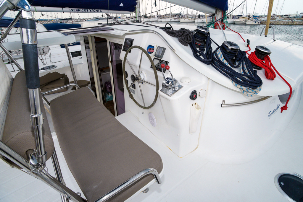 MY GIRL is a 4-cabin 4-head cruising catamaran located in Lavrion, Greece. Designed by the famous Joubert-Nivelt firm of architects, she features a solarium is located behind the helm, including 2 adjustable deckchairs.