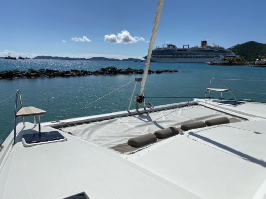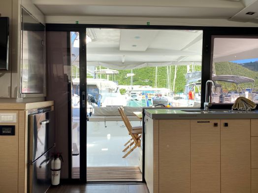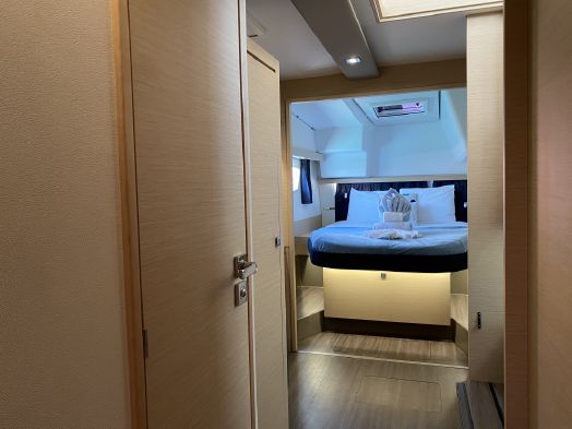 “My Obsession” is the best Fountaine Pajot Lucia 40 Layout! The Maestro 3 Cabin / 2 Head. Having two heads provides a large bathroom for the master suite and a large shared bathroom for the guests with a true shower stall.