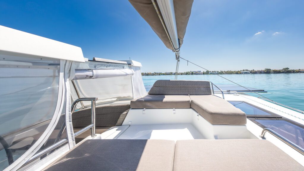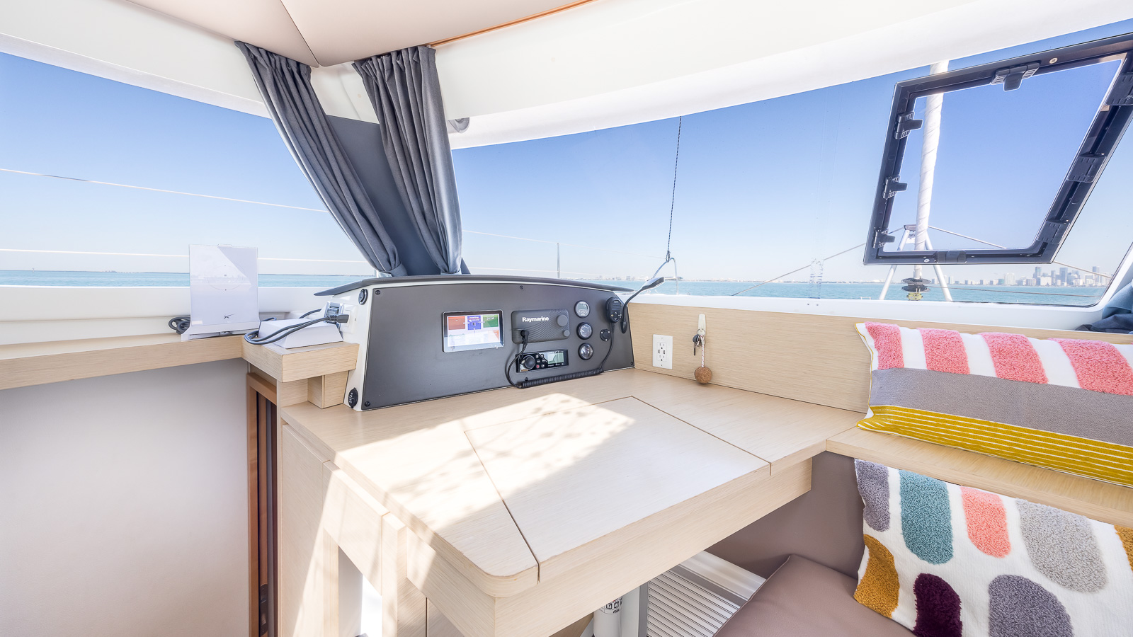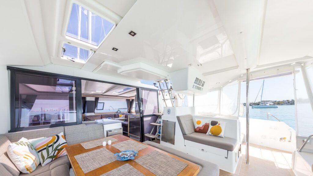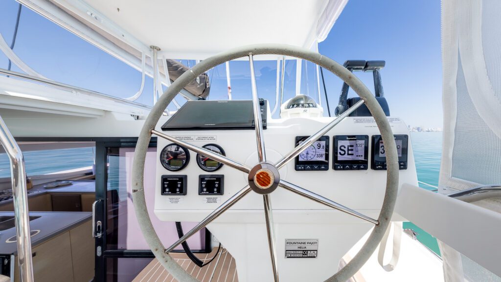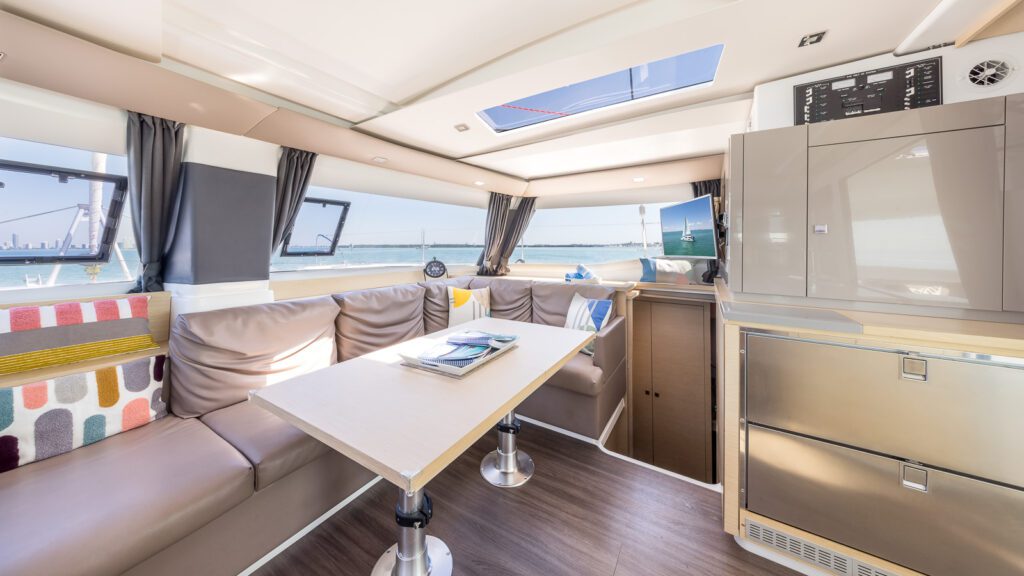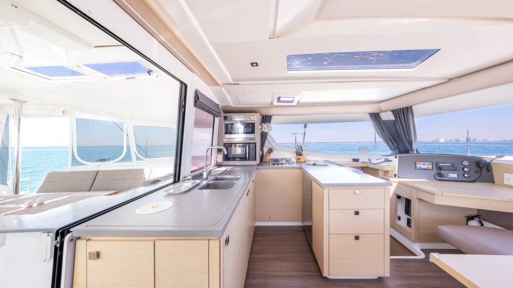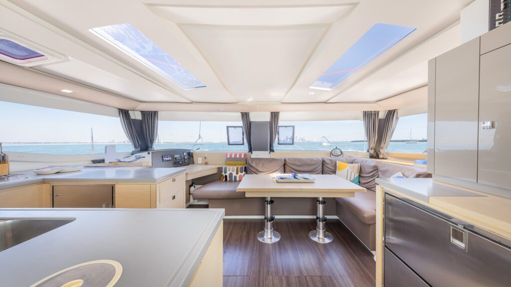 Introduced as a refined version of one of Fountaine Pajot’s most successful cruising catamarans, the Evolution model features redesigned hull portholes for increased natural light, a repositioned mast for improved panoramic views from the saloon, and a contemporary open-plan galley connecting seamlessly with the cockpit. The updated helm station offers excellent visibility for comfortable short-handed sailing, while the coachroof sun lounge creates additional outdoor living space.