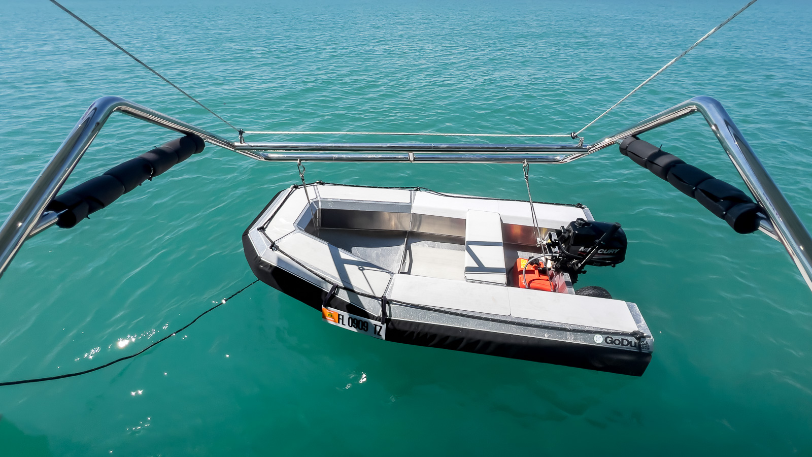 • Aluminum GoDu 8.5 tender (new 2024) with Mercury 6 hp outboard