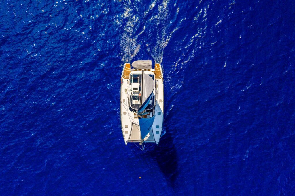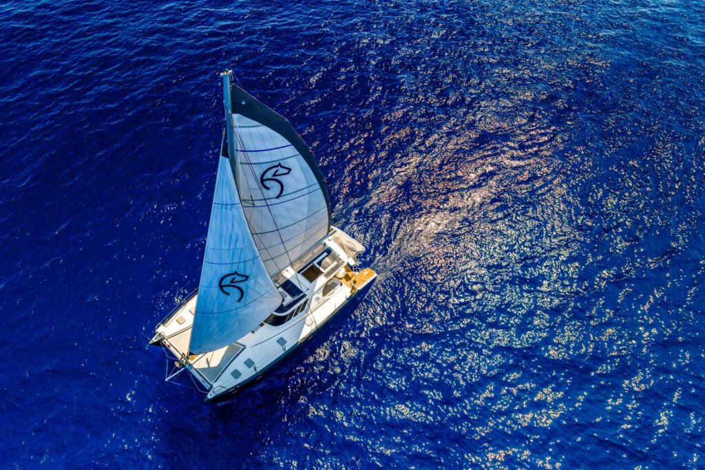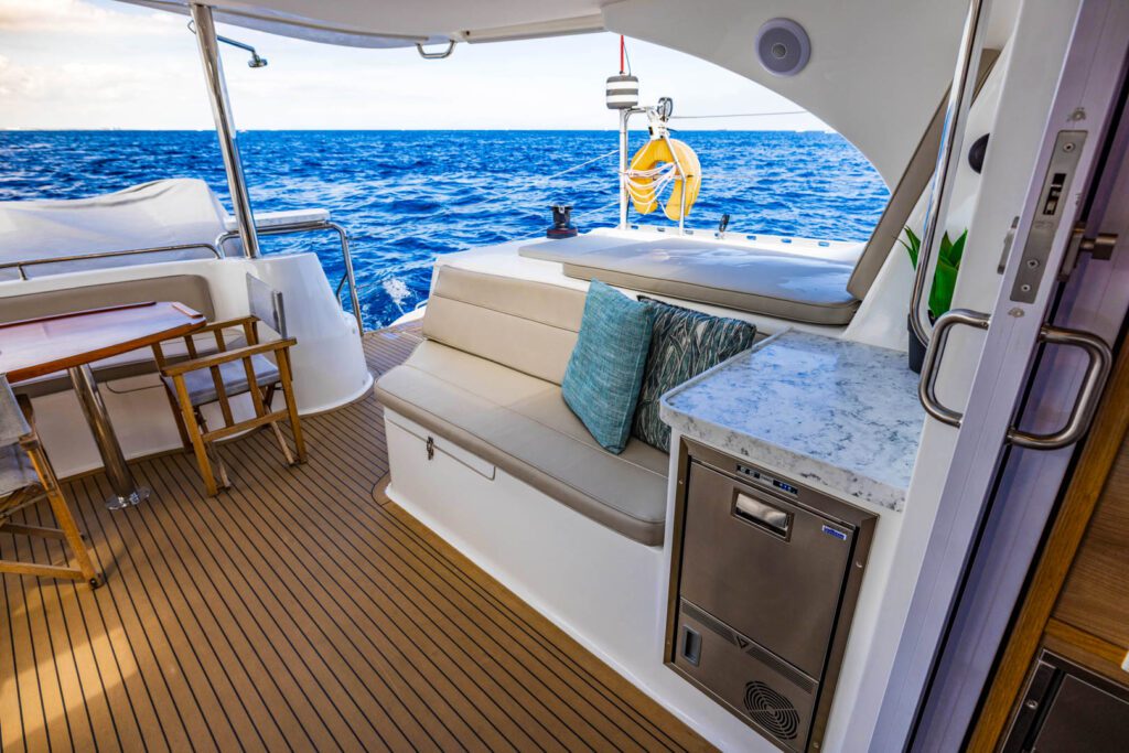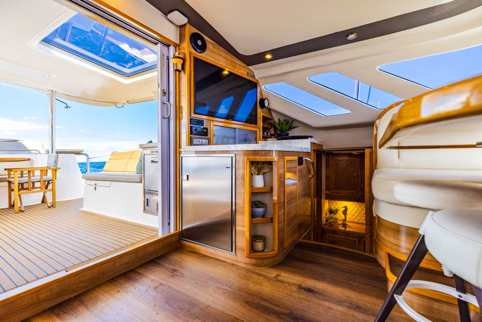 Step inside and the difference becomes even more apparent. GILLI GIRL’s professionally curated interior sets her apart from the rest of the fleet. High end galley appliances, thoughtfully selected finishes, and a cohesive aesthetic extend throughout the vessel, down to the designer tableware, linens, and flooring. The result is a turnkey luxury catamaran that feels intentionally designed rather than just simply outfitted.
