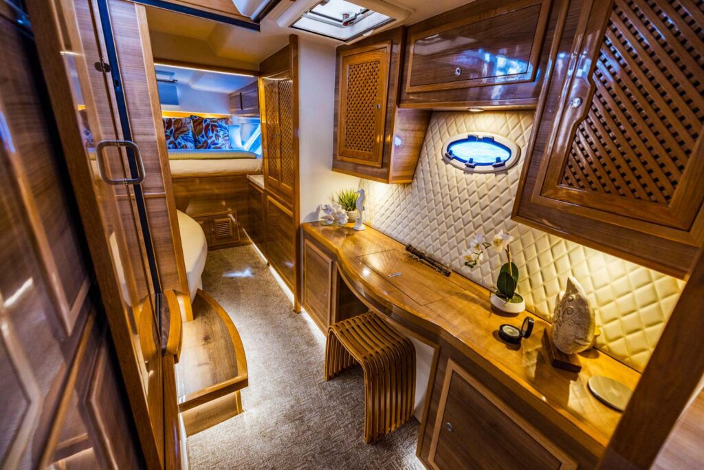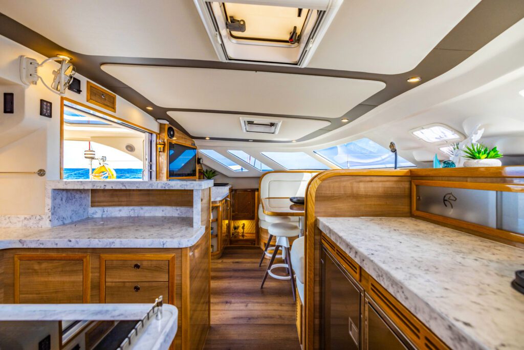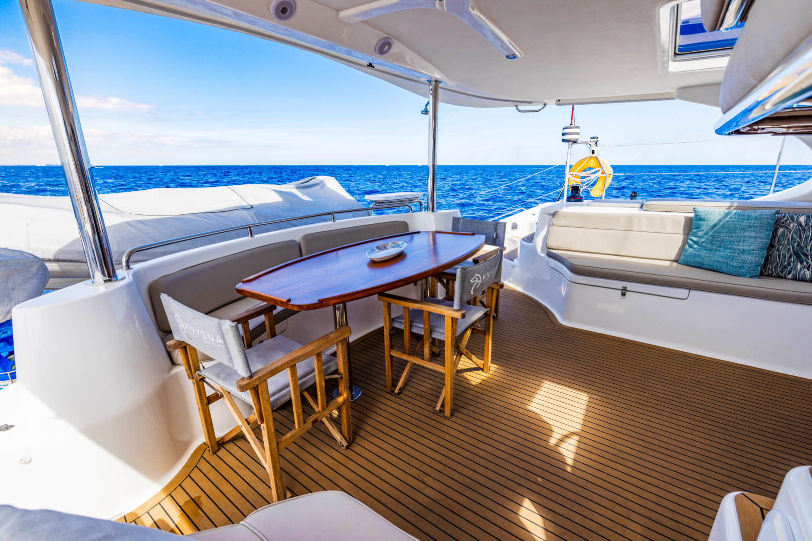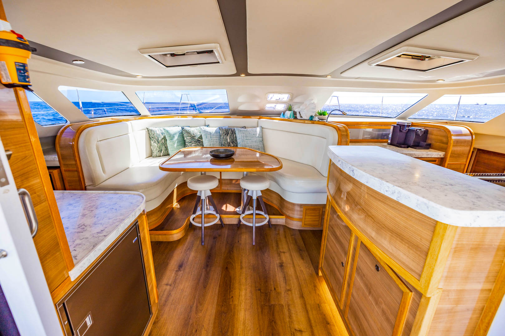 Step inside and the difference becomes even more apparent. GILLI GIRL’s professionally curated interior sets her apart from the rest of the fleet. High end galley appliances, thoughtfully selected finishes, and a cohesive aesthetic extend throughout the vessel, down to the designer tableware, linens, and flooring. The result is a turnkey luxury catamaran that feels intentionally designed rather than just simply outfitted.