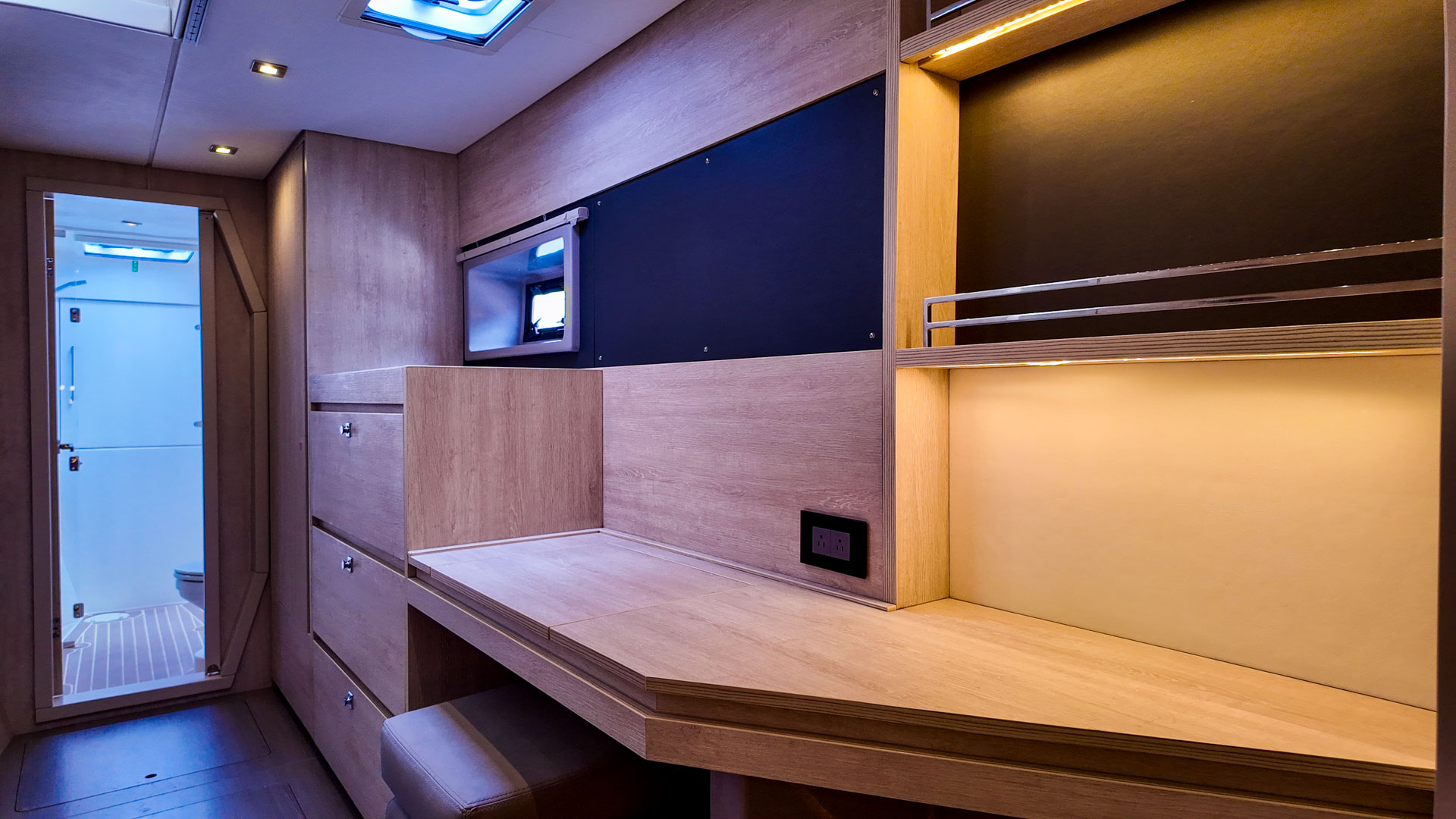 - Caframo Bora 12V DC fans throughout saloon and cabins