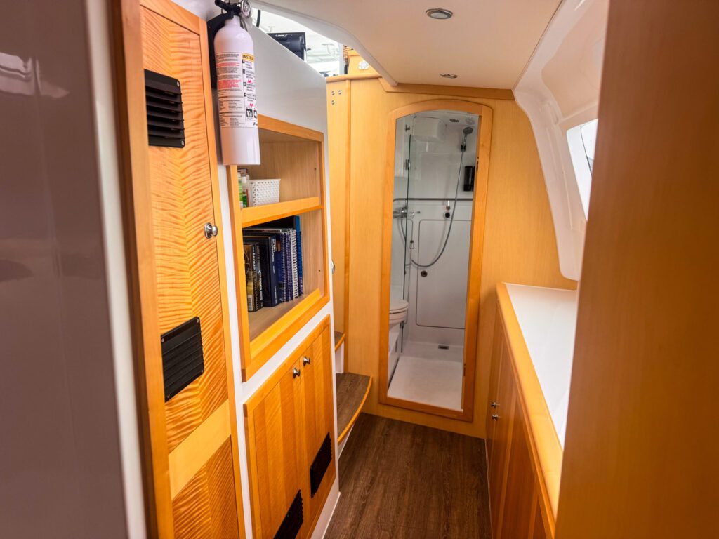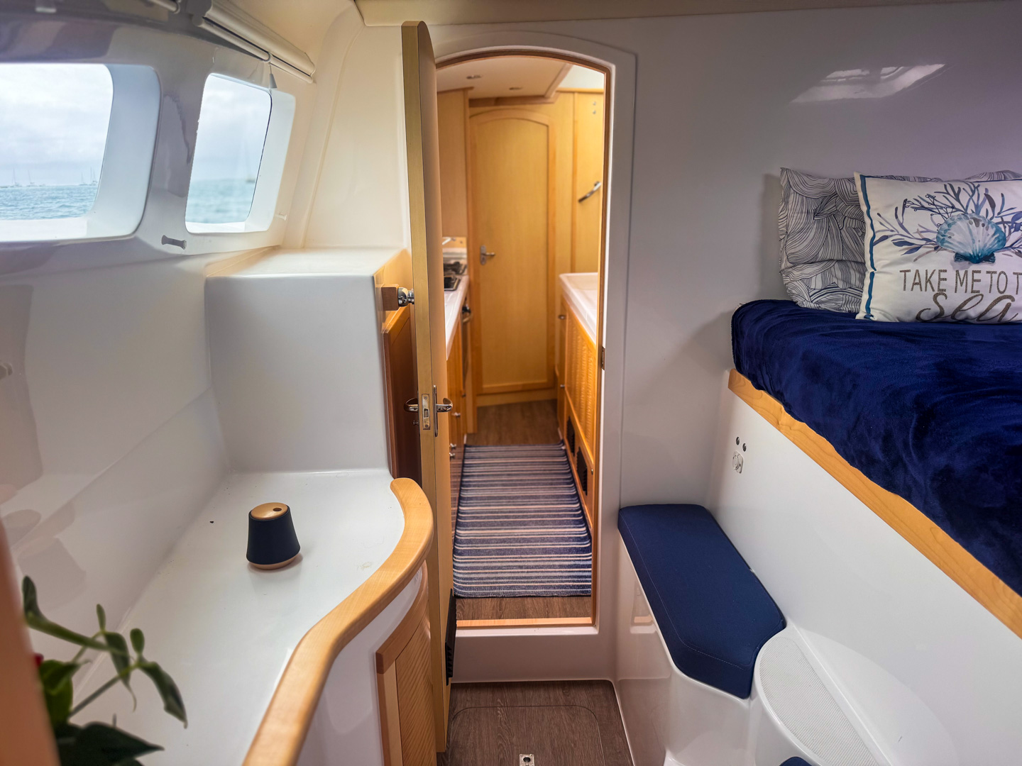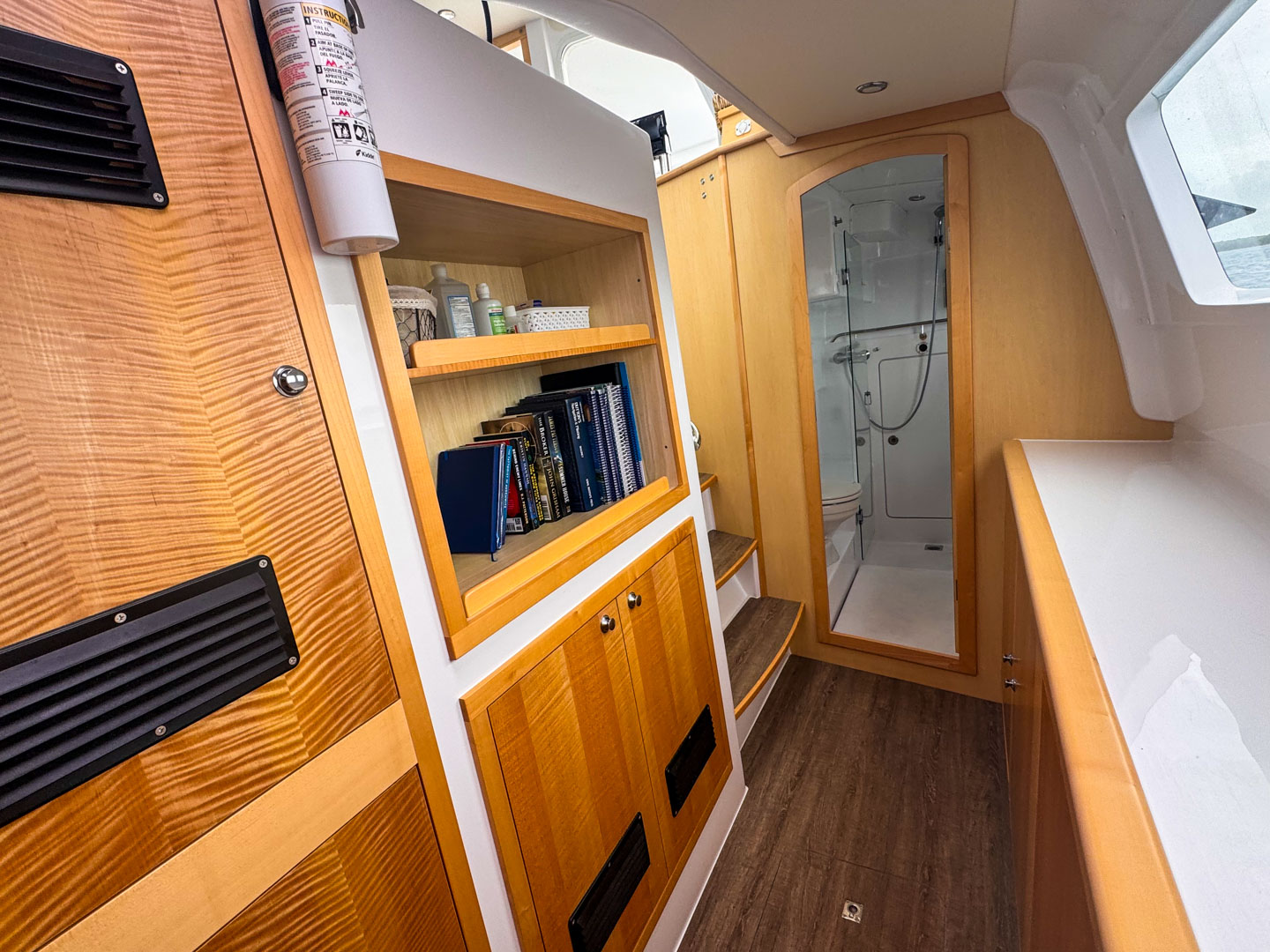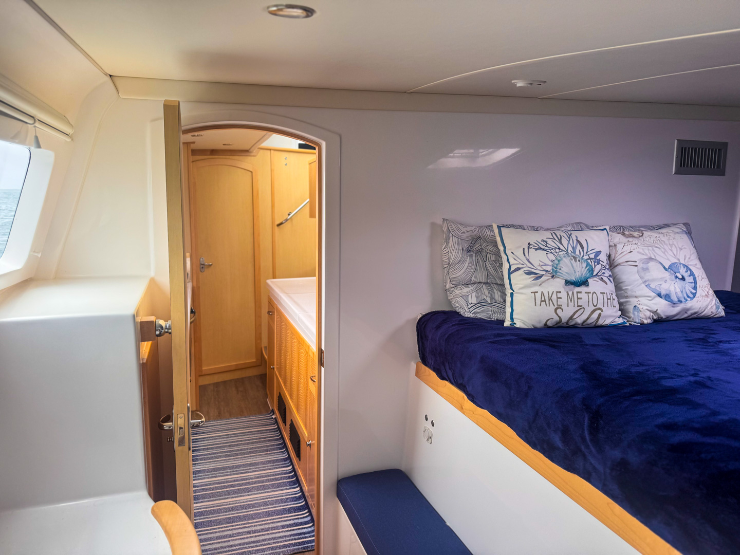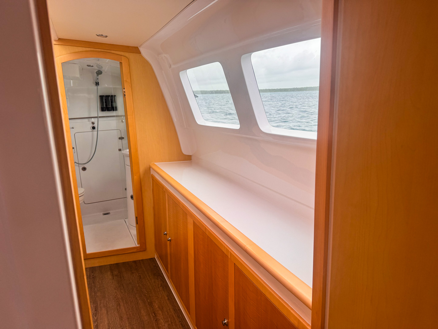 “Outrageous II” features the highly desirable three-cabin owner’s version layout, offering a spacious, private owner’s hull to port and two well-appointed guest cabins to starboard. This configuration provides the perfect blend of comfort, storage, and privacy for extended cruising while maintaining excellent resale appeal.
