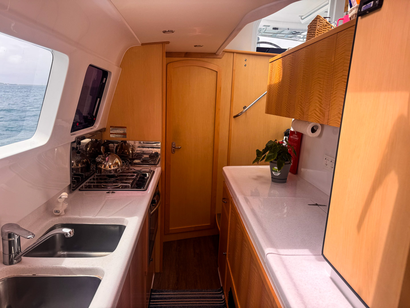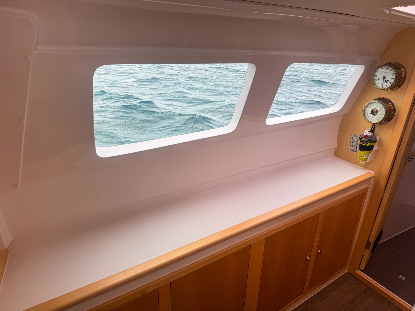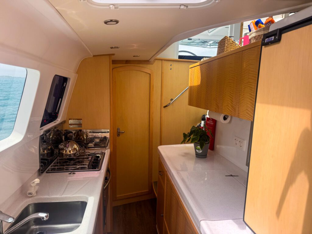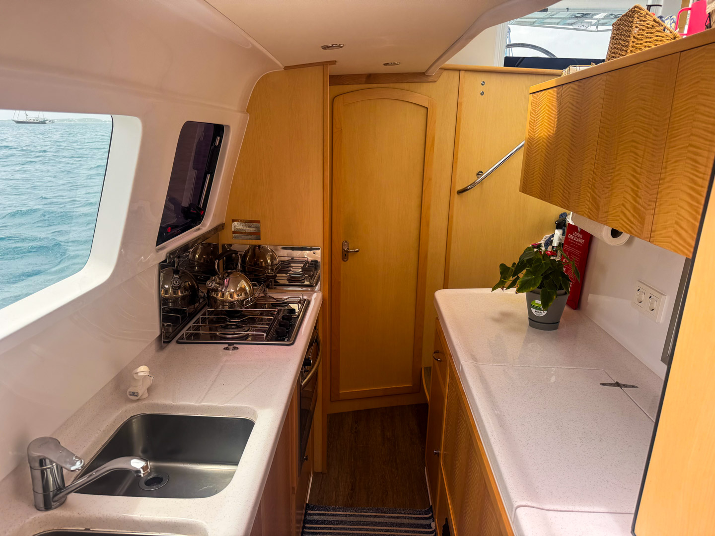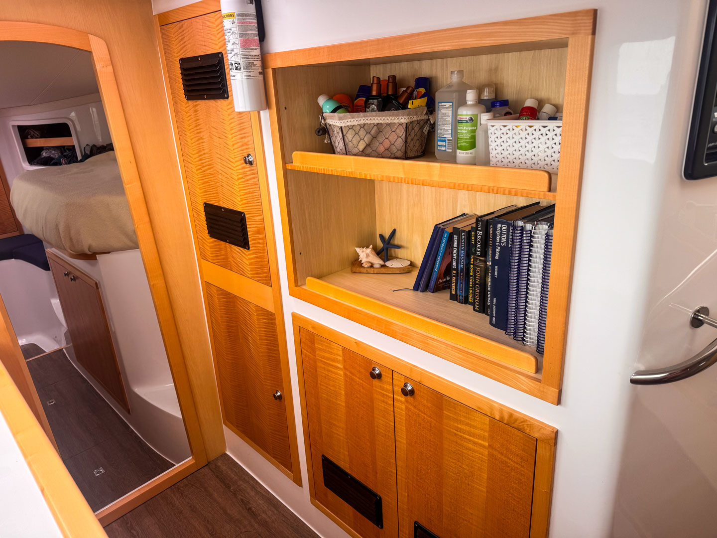 “Outrageous II” features the highly desirable three-cabin owner’s version layout, offering a spacious, private owner’s hull to port and two well-appointed guest cabins to starboard. This configuration provides the perfect blend of comfort, storage, and privacy for extended cruising while maintaining excellent resale appeal.