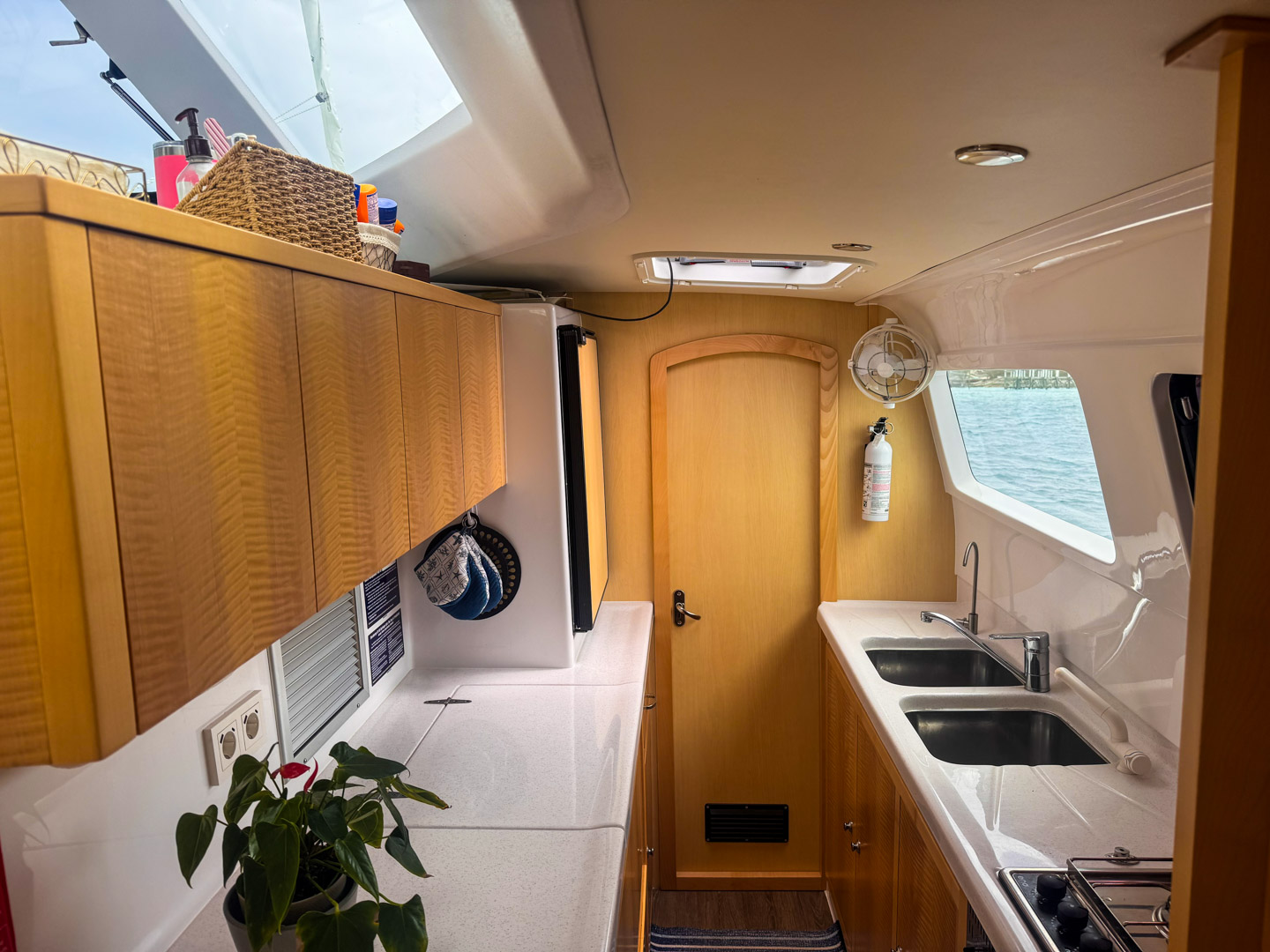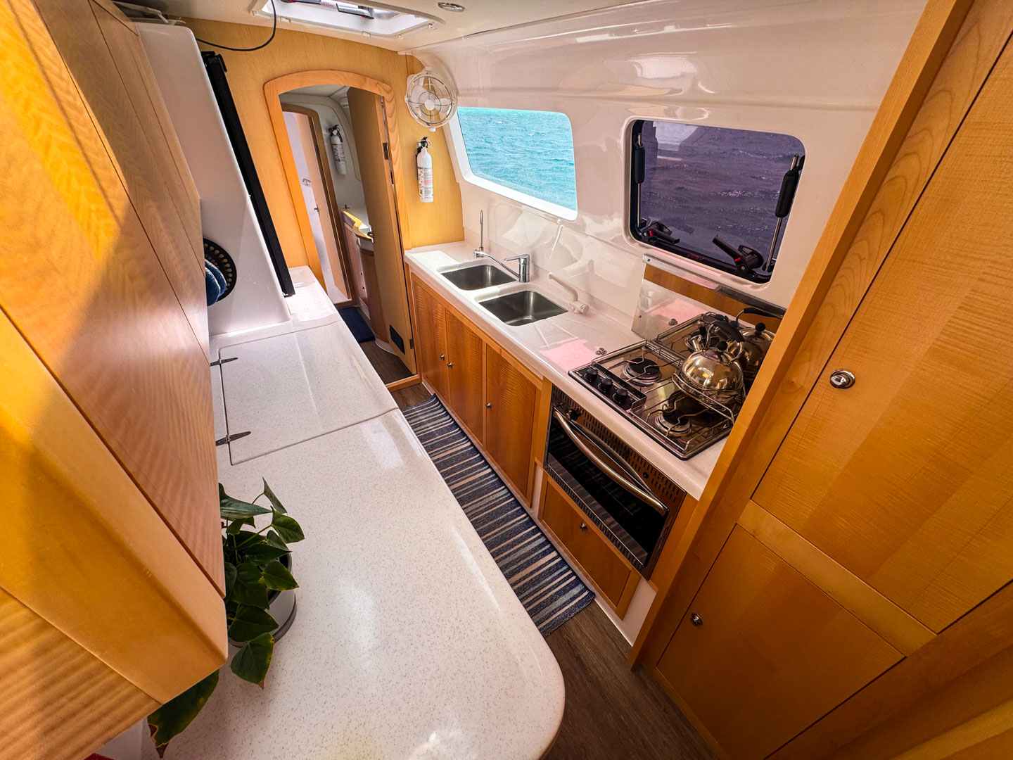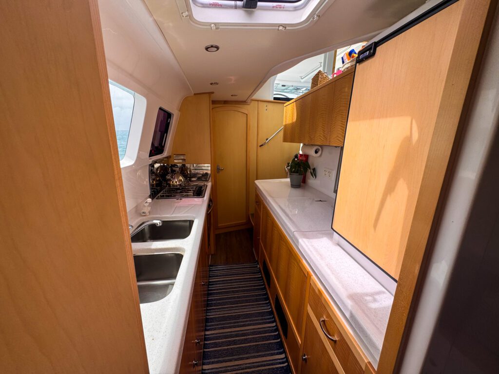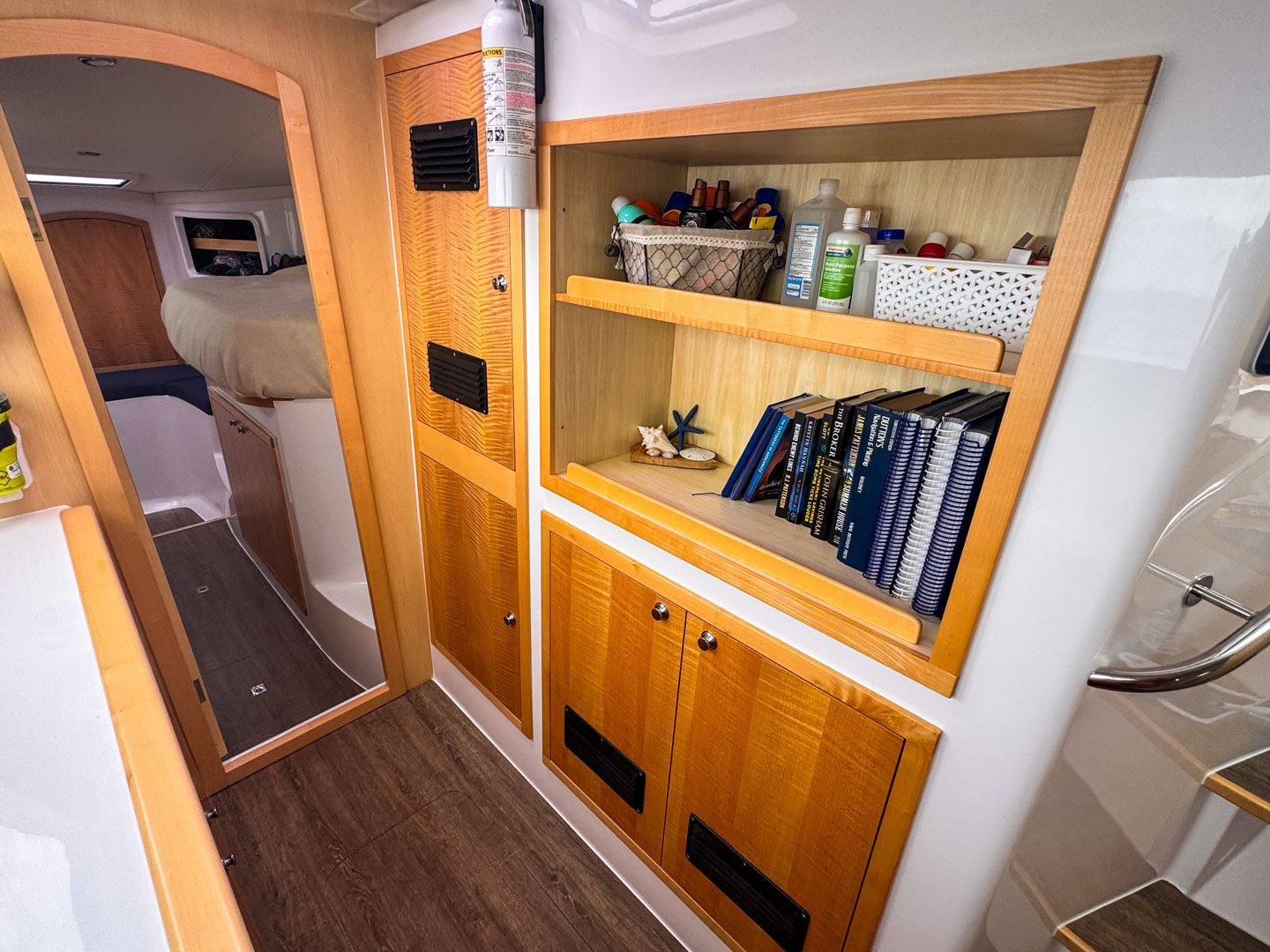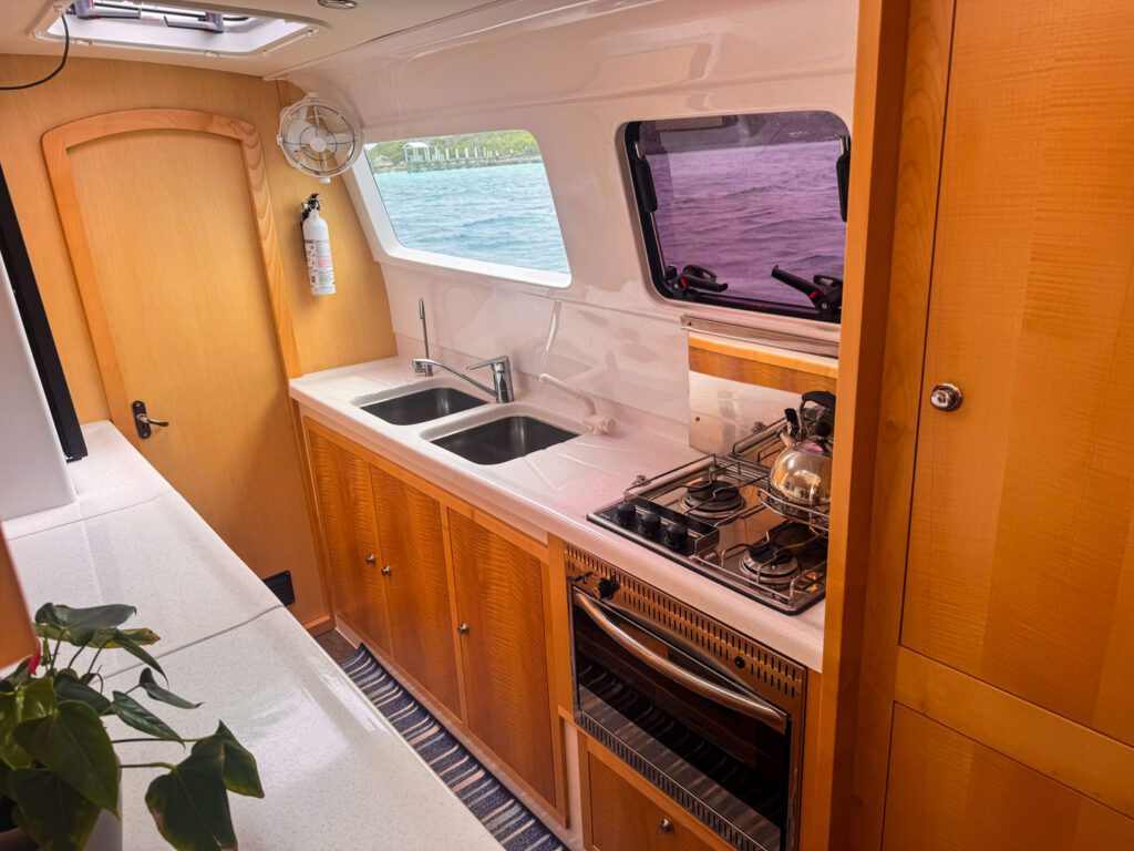 “Outrageous II” features the highly desirable three-cabin owner’s version layout, offering a spacious, private owner’s hull to port and two well-appointed guest cabins to starboard. This configuration provides the perfect blend of comfort, storage, and privacy for extended cruising while maintaining excellent resale appeal.