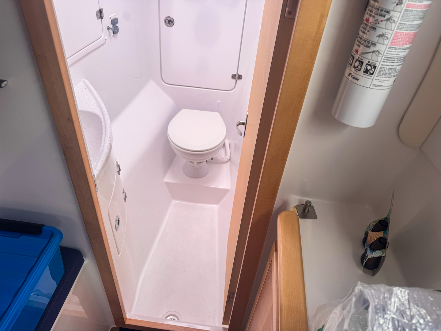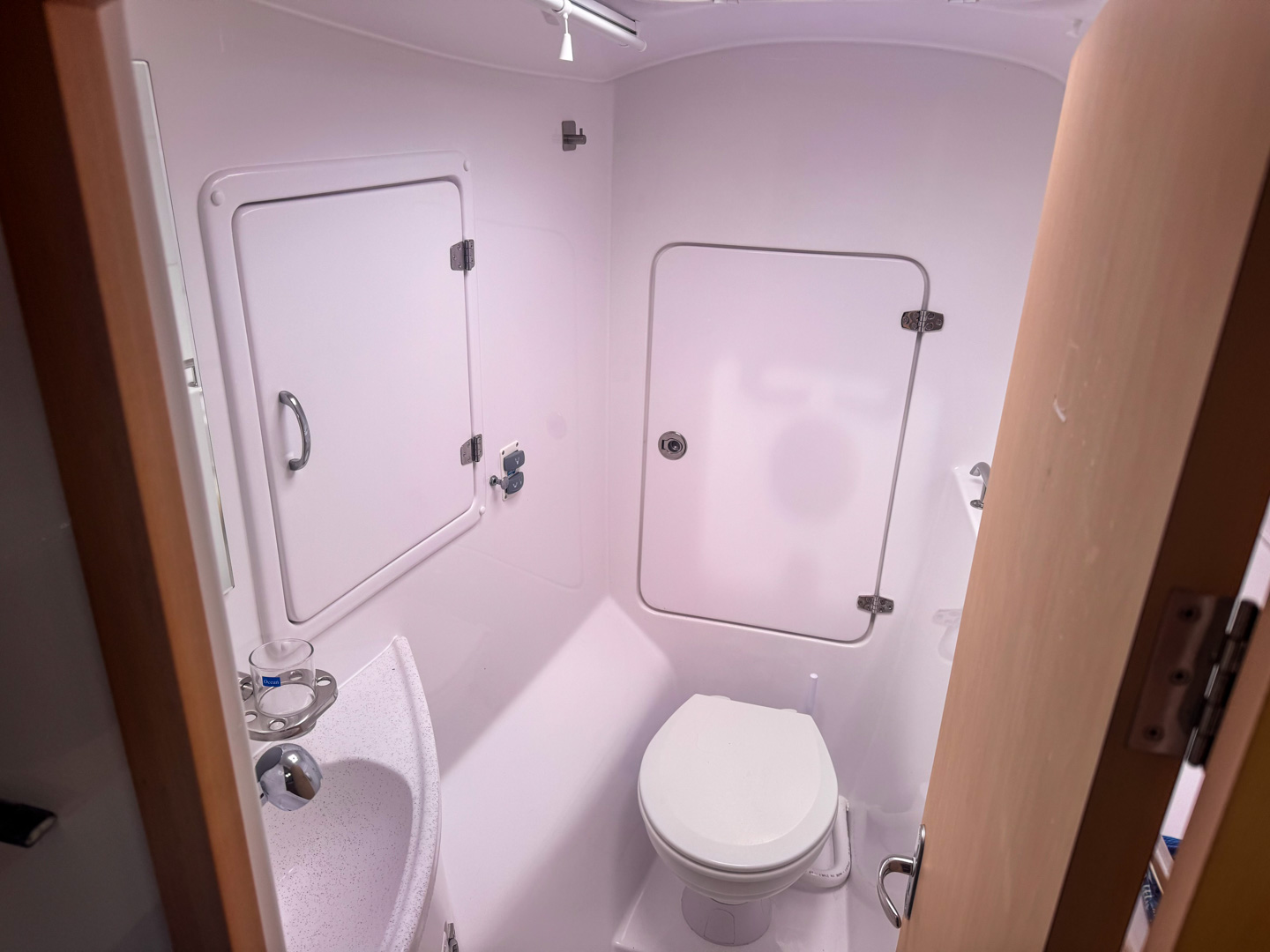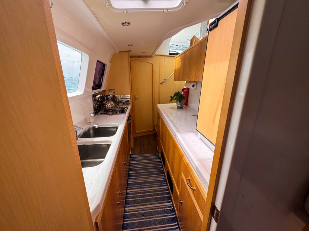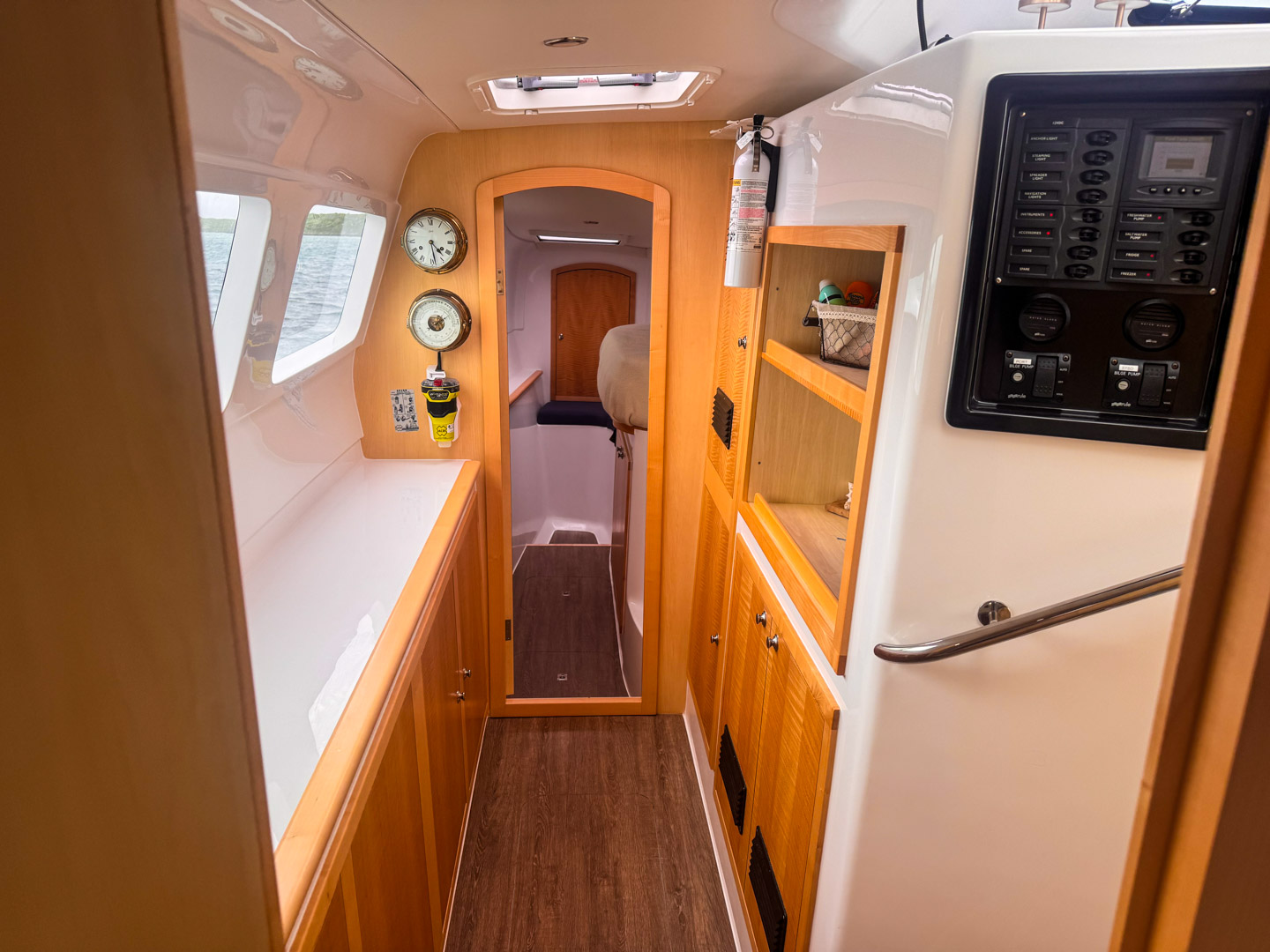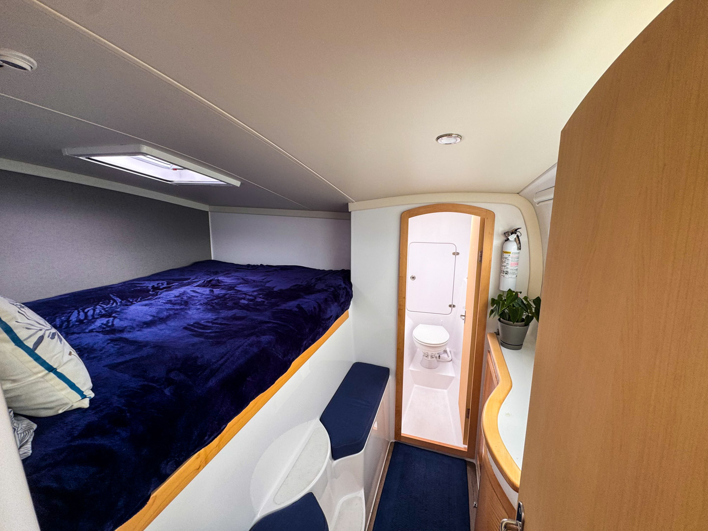 “Outrageous II” features the highly desirable three-cabin owner’s version layout, offering a spacious, private owner’s hull to port and two well-appointed guest cabins to starboard. This configuration provides the perfect blend of comfort, storage, and privacy for extended cruising while maintaining excellent resale appeal.