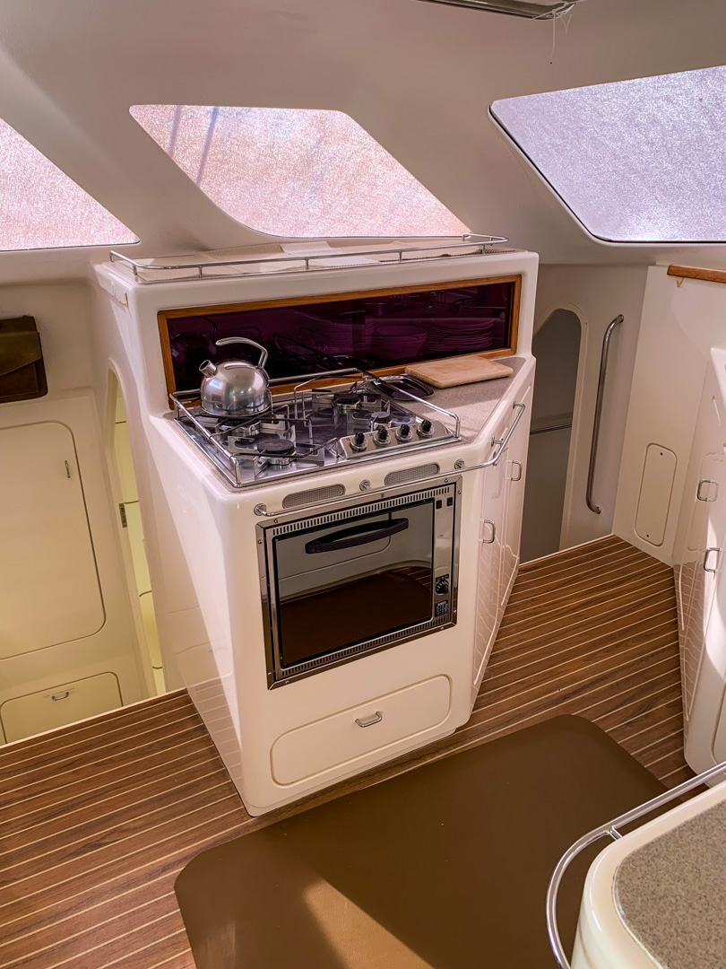 Spacious Interior: Features a bright and airy salon with panoramic views, an ergonomic galley-up design, and a dedicated navigation station.