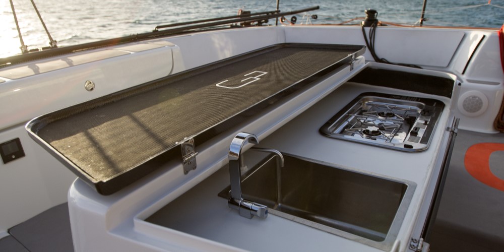 The interior of the G4 foiling catamaran offered space and comfort according to the less is more philosophy. The extremely spacious cockpit could be used for the preparation and consumption of meals or even a party with 15 people. The cabin even gave full standing height at the entrance. The interior was completed with two queen-sized beds and a spacious sofa for 6 to 8 people. Thanks to the great panoramic views, this is a great place to eat, read or navigate. The comfort on board made the G4 suitable for long weekends, where you can travel distances of 300 nautical miles.