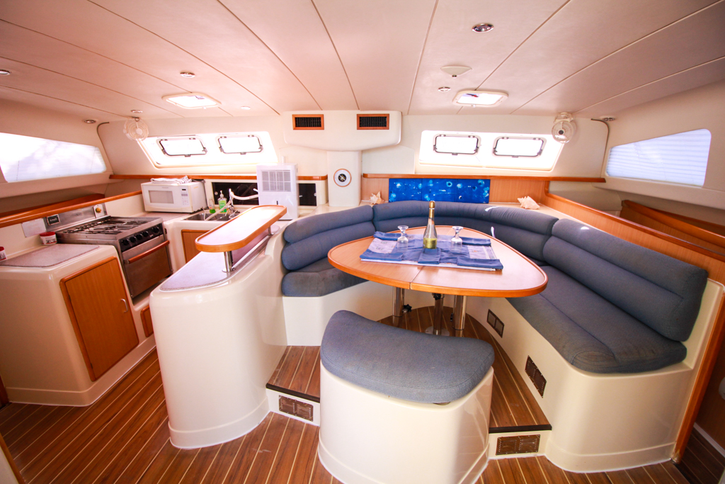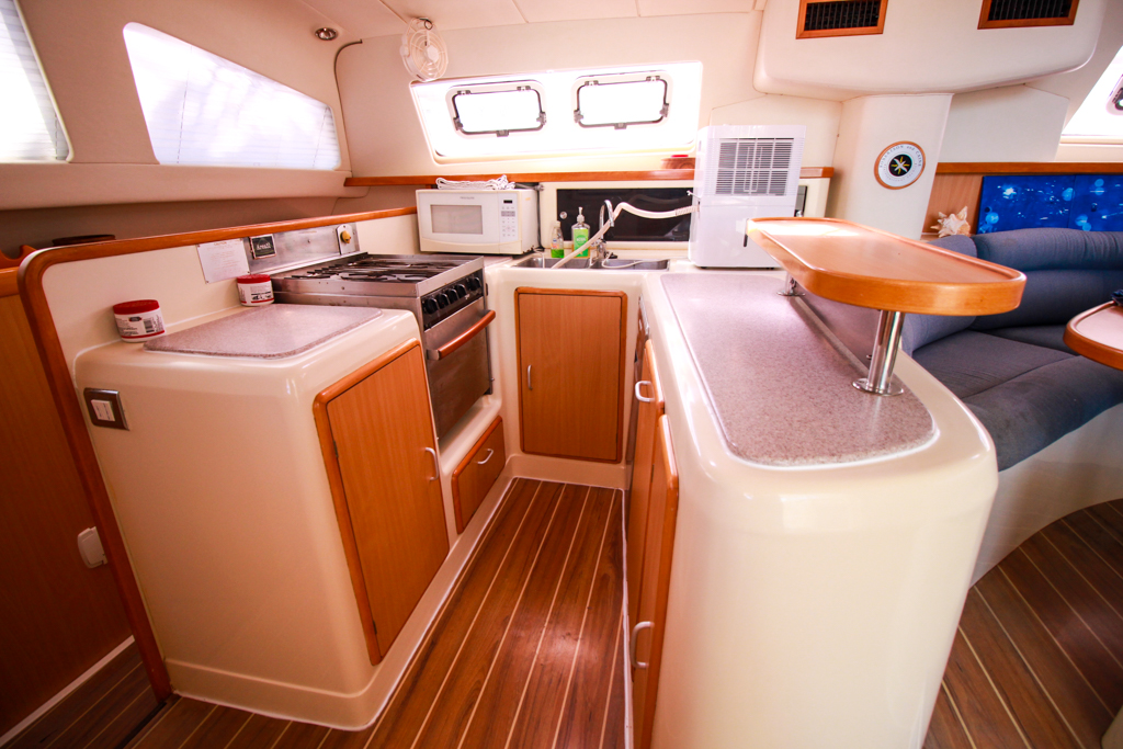 The Leopard 47 is the best combination of space, performance, quality, and value. Built in Cape Town, South Africa, and outfitted with US equipment, including complete electronics, generator, and air conditioning. The Leopard 47 features a galley up, private and spacious heads, an aft platform with direct easy access to the cockpit, and great performance under power and sail.
