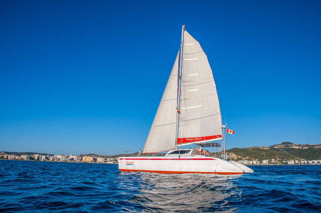 PROMYK is a Looping 50 catamaran designed by French naval architect Patrick Luscher. His designs are famous for their simplicity, lightness and speed, while being functional and easy to use. About 25 such catamarans sail around the world.