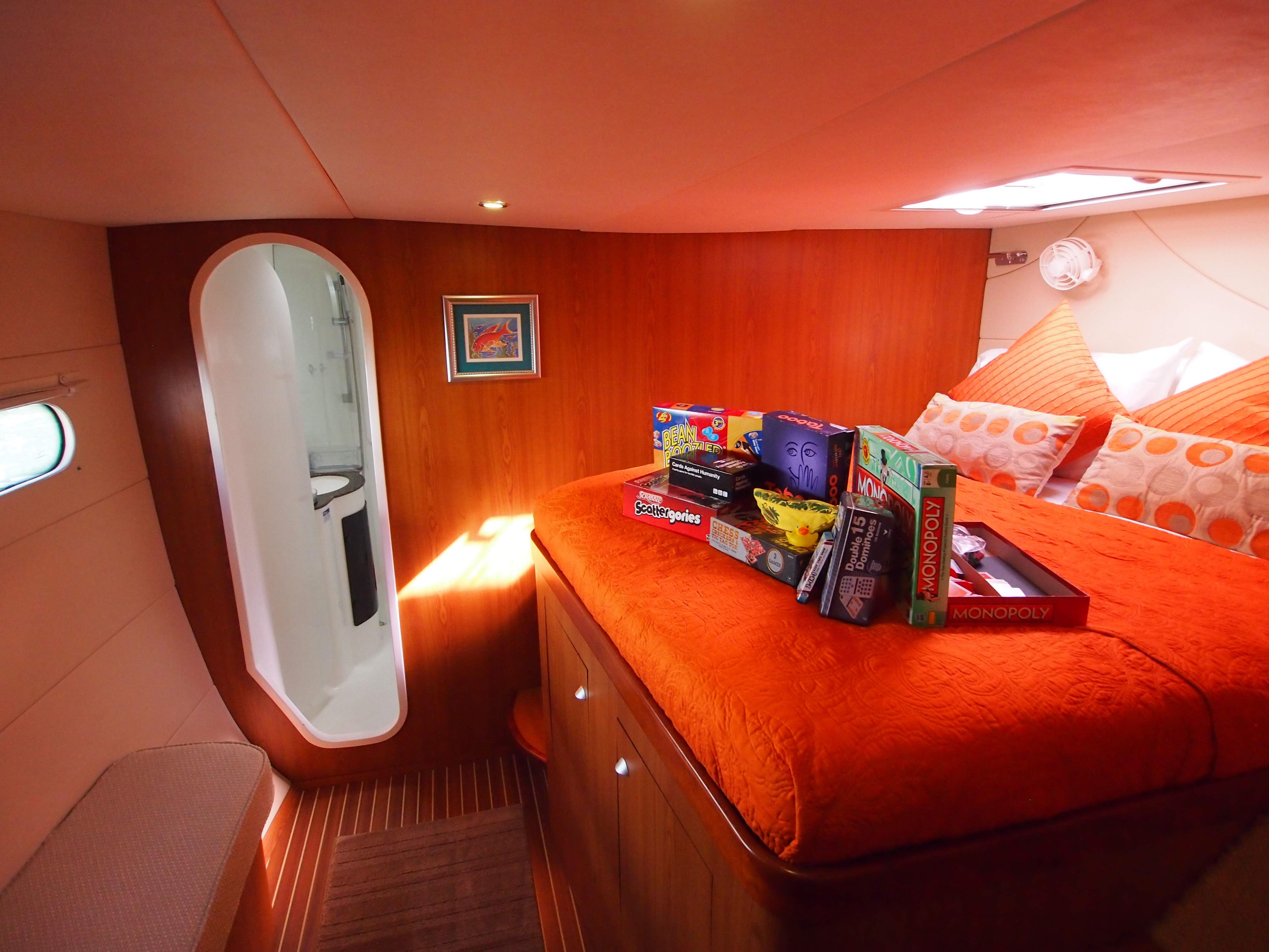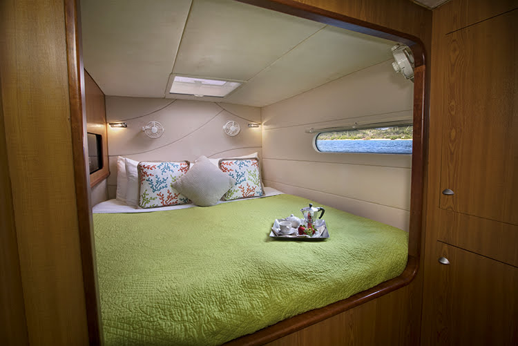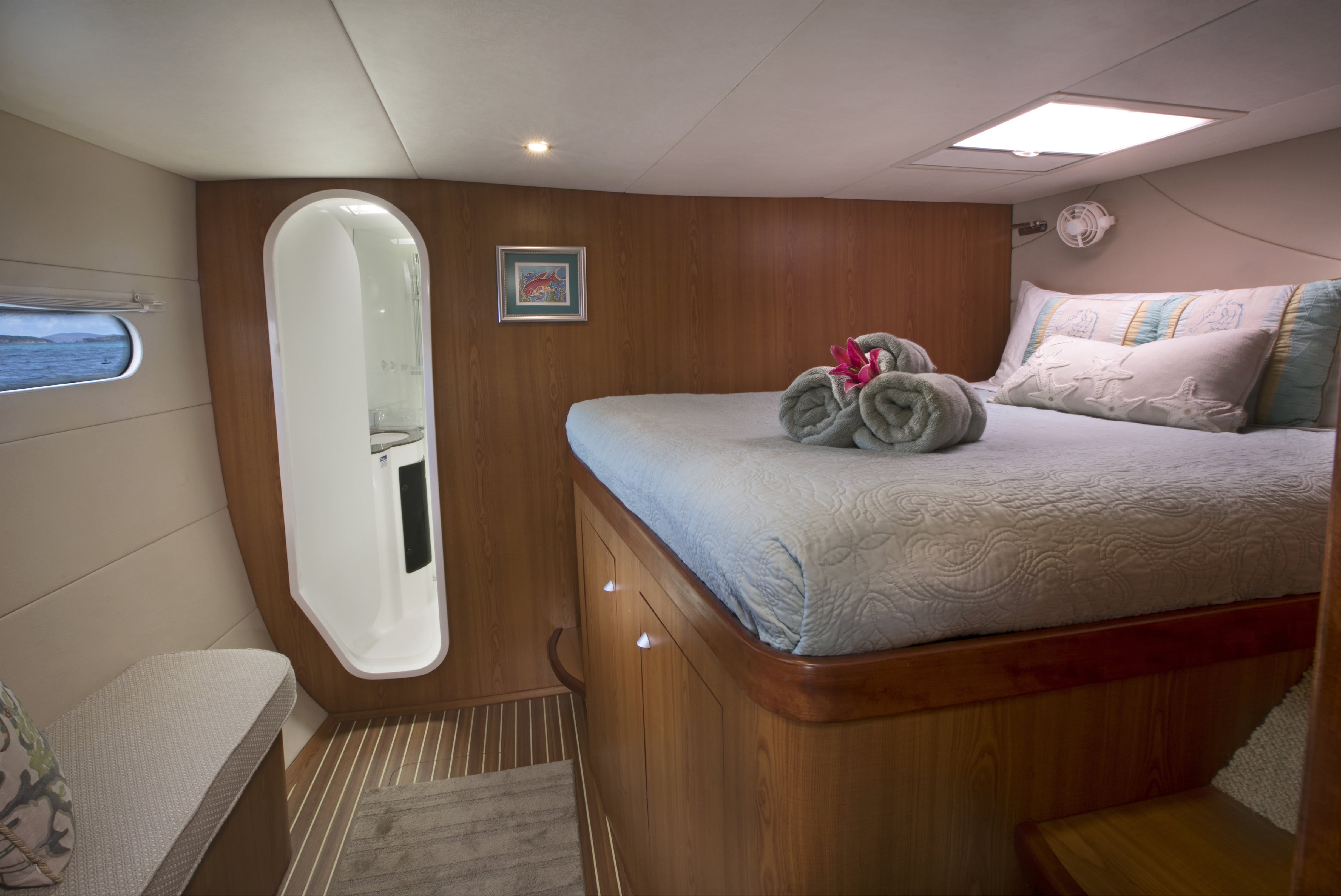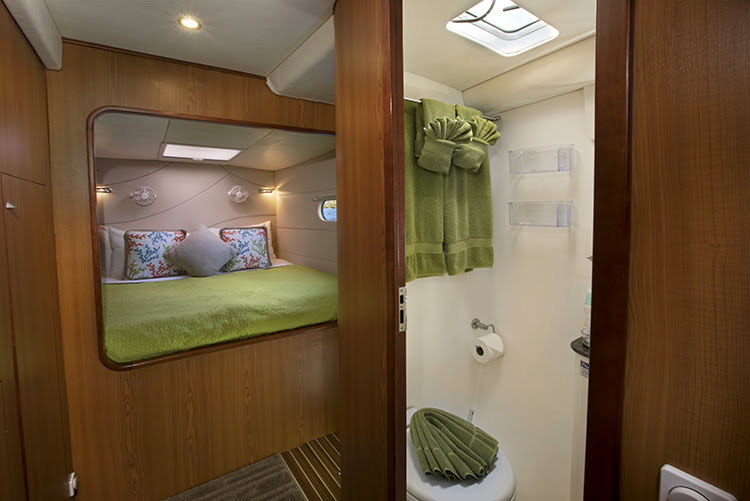 HAPPY TIME has four staterooms, two with queen sized beds and two with king-sized beds. Each cabin has a large bathroom equipped with separate shower stalls and full-sized fresh water flush electric toilets.