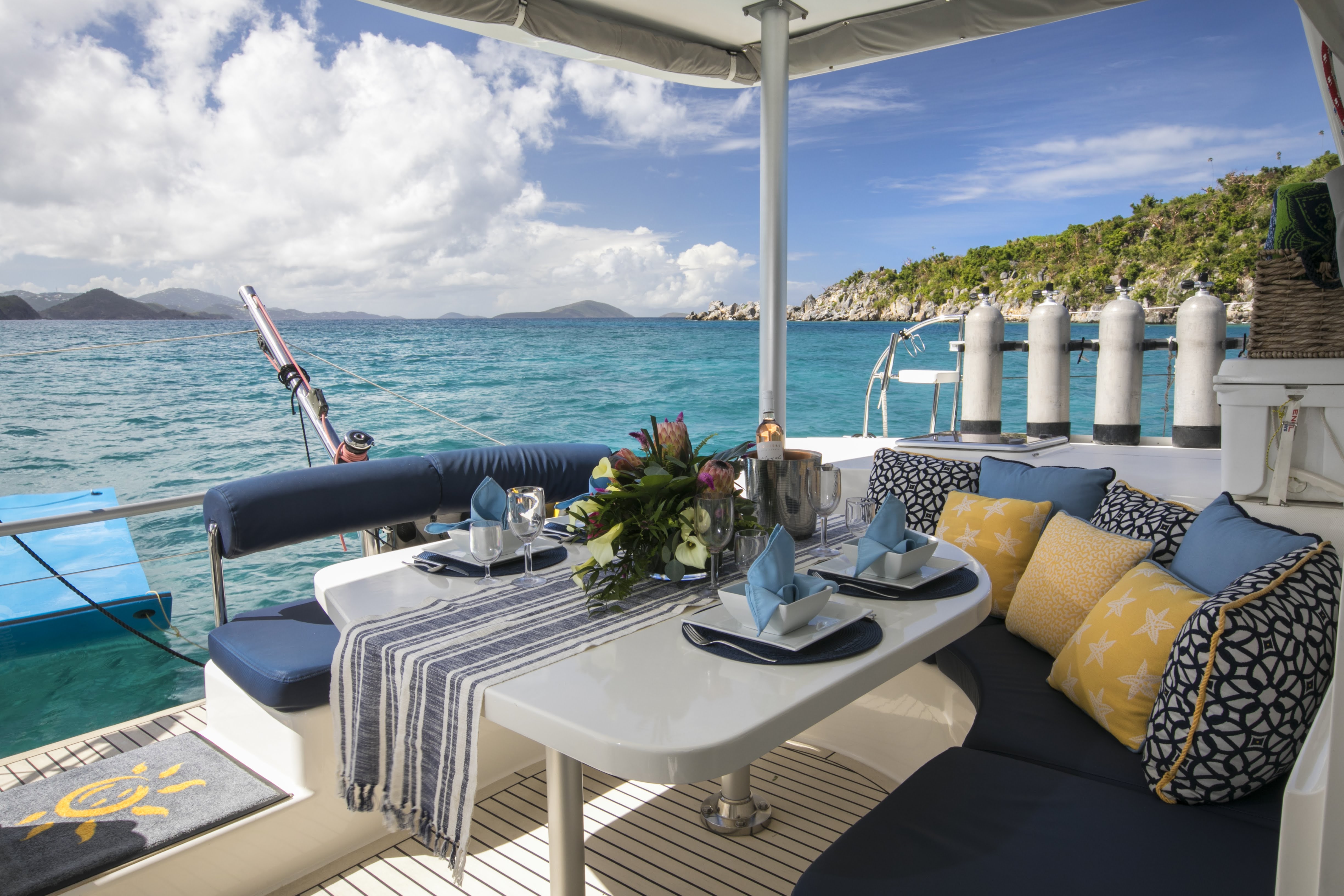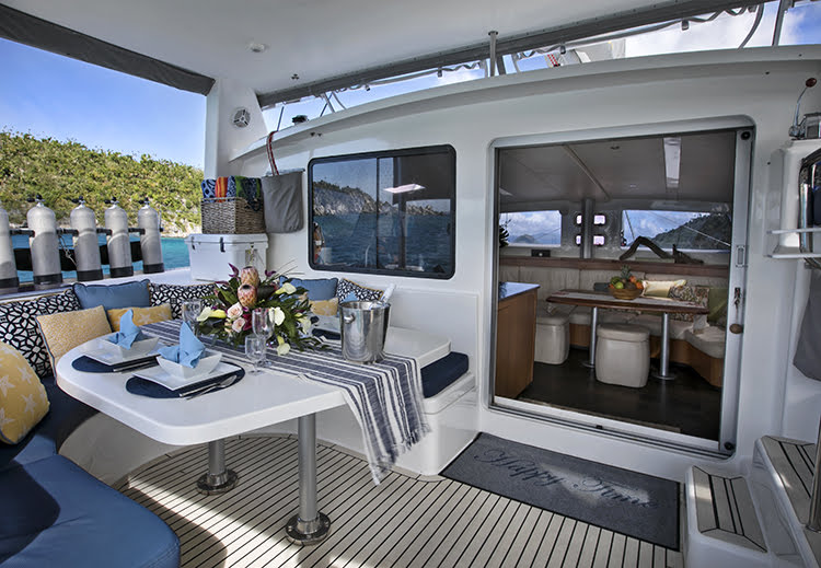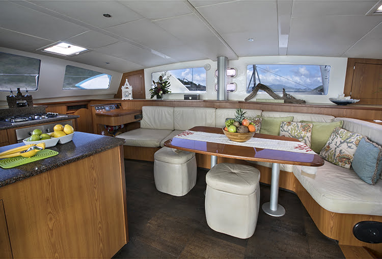 Her accommodations are comfortable, voluminous and fully air-conditioned. The immediate impression upon boarding Happy Time is one of spaciousness and generous headroom (6’8″ in the salon and 6’5″ in the staterooms).