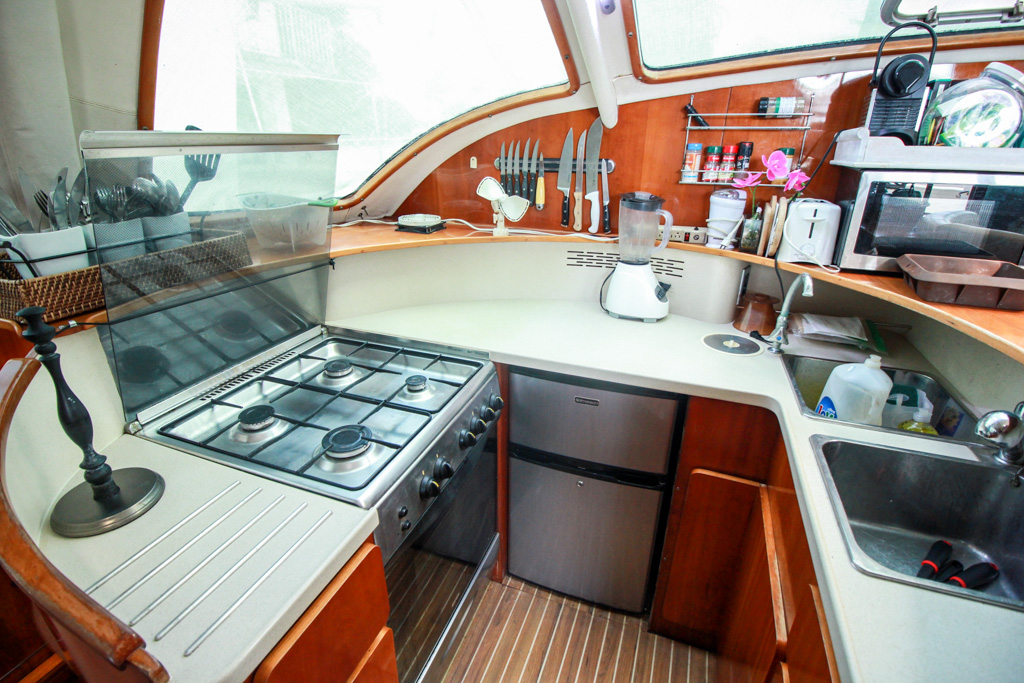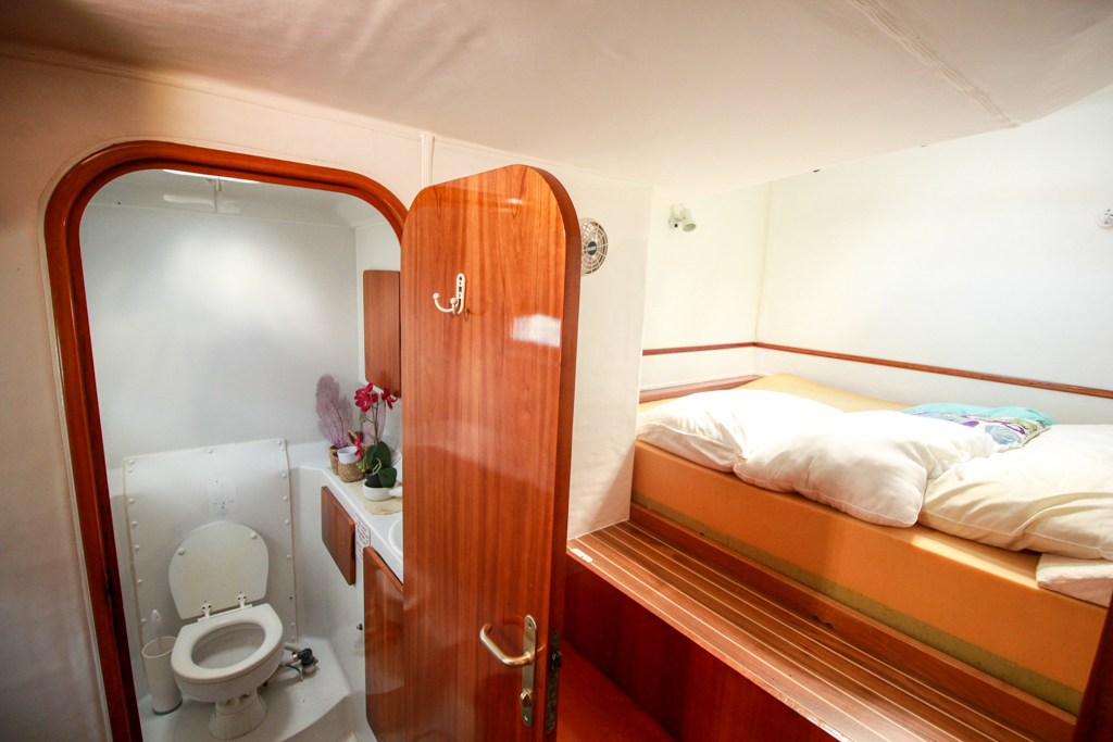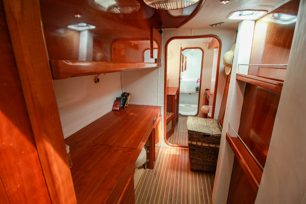 All electronics and equipment were Refurbished and fully re-equipped in 2019. Starboard owners’ hull has a large double berth. A separate toilet and shower, a large desk area, a vanity desk, two large closets, and Privacy door from main salon. Main salon has oval settee with full size table, great light and ventilation.