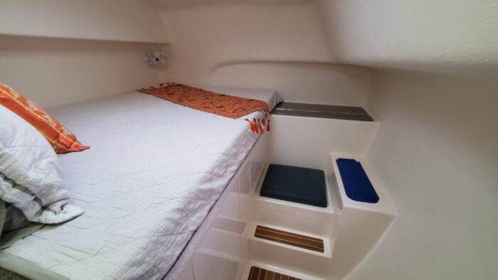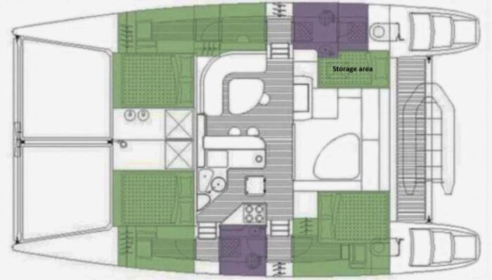 - 2 cabins with walk-through “Jack and Jill” shared head in port hull