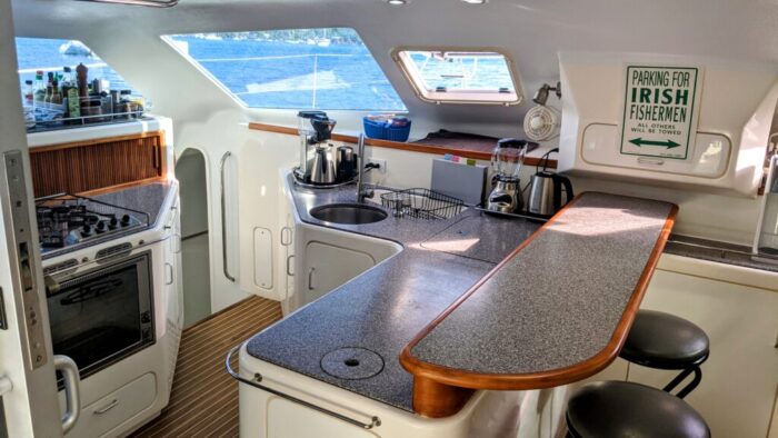 - Bar counter separates Galley from Salon, and seats 2 on custom leather top bar stools. A perfect area for breakfast or for evening cocktails whilst multiple people are busy making some magic in the galley.